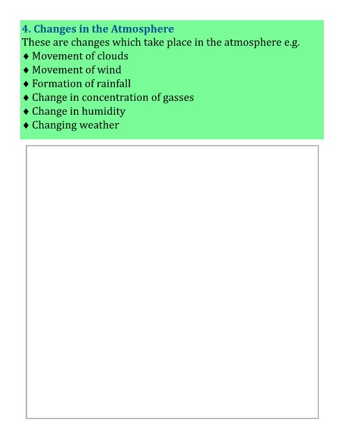 4. Changes in the Atmosphere These are changes which take place in the atmosphere e.g. Movement of clouds Movement of wind Formation of rainfall Change in concentration of gasses Change in humidity Changing weather