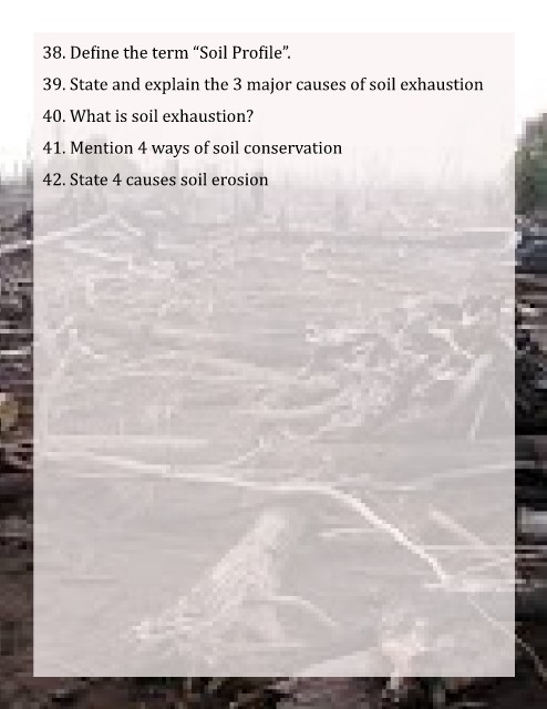 38. Define the term “Soil Profile” . 39. State and explain the 3 major causes of soil exhaustion 40. What is soil exhaustion? 41. Mention 4 ways of soil conservation 42. State 4 causes soil erosion