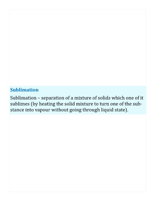 Sublimation Sublimation – separation of a mixture of solids which one of it sublimes (by heating the solid mixture to turn one of the sub- stance into vapour without going through liquid state).