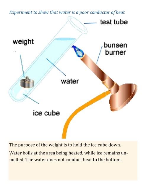 Experiment to show that water is a poor conductor of heat The purpose of the weight is to hold the ice cube down. Water boils at the area being heated, while ice remains un- melted. The water does not conduct heat to the bottom.