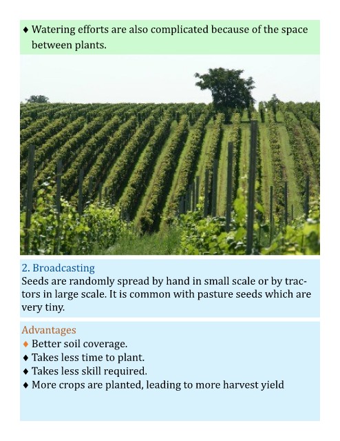 Seeds are randomly spread by hand in small scale or by trac-