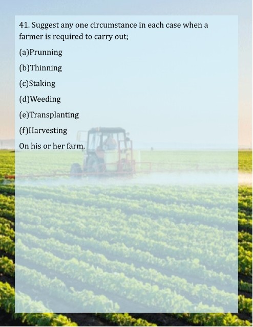 41. Suggest any one circumstance in each case when a farmer is required to carry out; (a)Prunning (b)Thinning (c)Staking (d)Weeding (e)Transplanting (f)Harvesting On his or her farm.