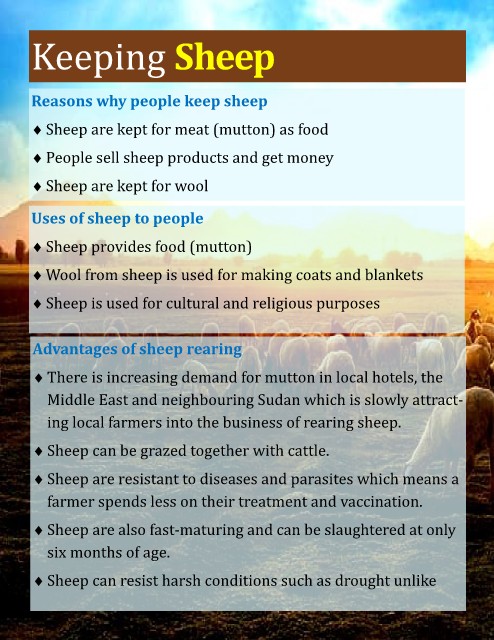 Sheep are kept for meat (mutton) as food