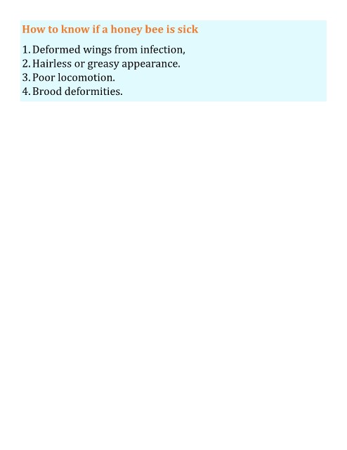 How to know if a honey bee is sick 1. Deformed wings from infection, 2. Hairless or greasy appearance. 3. Poor locomotion. 4. Brood deformities.