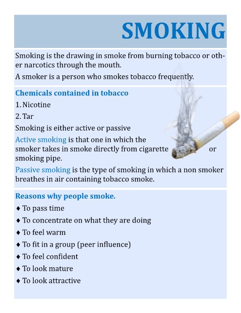 Smoking is the drawing in smoke from burning tobacco or oth-