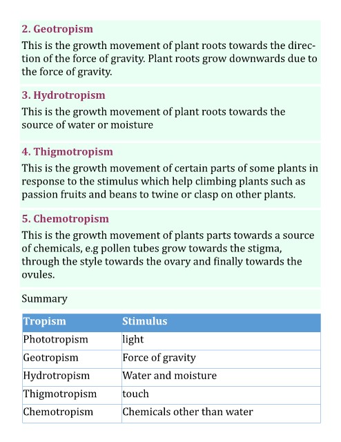 of chemicals, e.g pollen tubes grow towards the stigma,