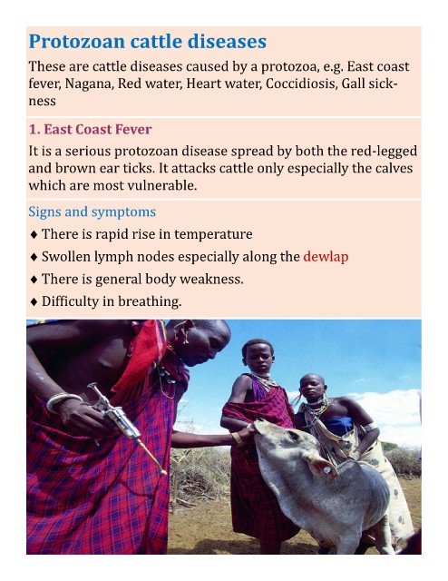 fever, Nagana, Red water, Heart water, Coccidiosis, Gall sick-
