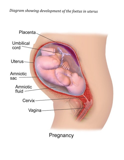 Diagram showing development of the foetus in uterus Placenta — Umbilical . cord \ \ _ Uterus Amniotic sac \ - Amniotic j fluid * t *r. Cervix Vagina Pregnancy