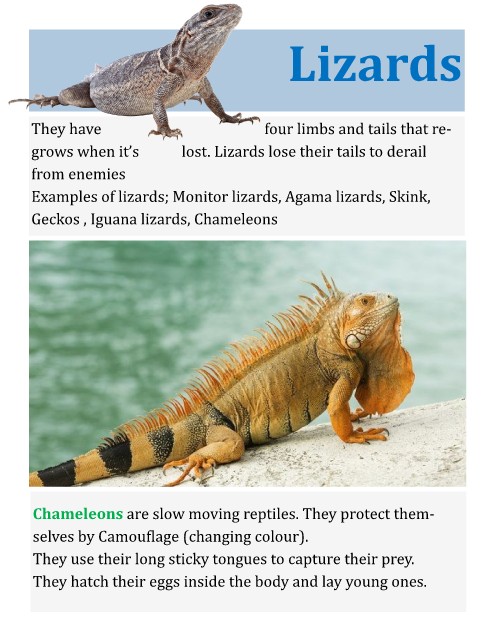 Examples of lizards; Monitor lizards, Agama lizards, Skink,