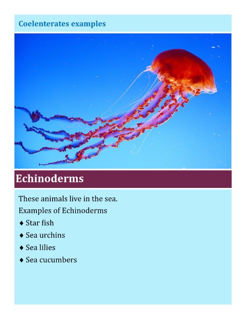 Coelenterates examples 0' mm V ; Jf , a yA A A ... - 5- *• A yrn Echinoderms These animals live in the sea. Examples of Echinoderms  Star fish  Sea urchins  Sea lilies  Sea cucumbers